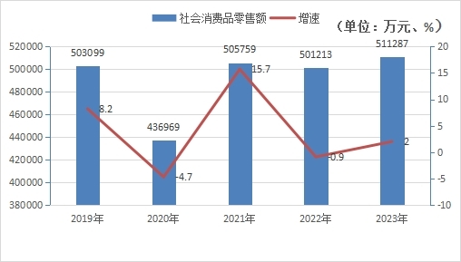 2023年全區全年完成社會消費品零售額511287萬元,比上年增長2%。按銷售地區分:城鎮的零售額為349407萬元,占全部零售額的68.3%,比上年增長1.5%;鄉村的零售額為161880萬元,占全部零售額的31.7%,比上年增長3.2%。按消費形態分:餐飲業消費零售額為27462萬元,比上年增長4%,占全部零售額的5.4%;商品消費零售額為483825萬元,占全部零售額的94.6%,比上年增長1.9%。在零售中,通過網絡零售12879.3萬元,比上年增長19%。8家外貿企業出口額3988萬元,比上年增長5.14%。