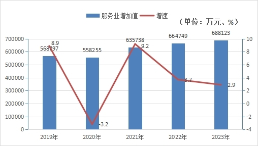 2023年全年服務業增加值完成688123萬元,比上年增長2.9%,其中:批發和零售業完成151826萬元,比上年增長3.3%;交通運輸、倉儲和郵政業完成169850萬元,比上年增長10.5%;住宿和餐飲業完成11964萬元,比上年增長12.1%;金融業28943萬元,比上年增長18%;房地產業完成114534萬元,比上年下降7.5%;營利性服務業完成49513萬元,下降13.2%;非營利性服務業完成153218萬元,增長7.2%;農、林、牧、漁服務業完成8275萬元,比上年增長4.5%。