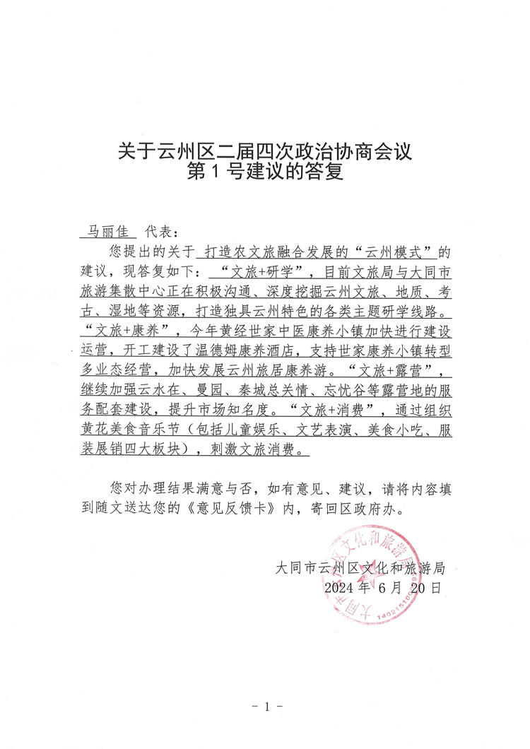 關于云州區二屆四次政治協商會議第1號建議的答復
